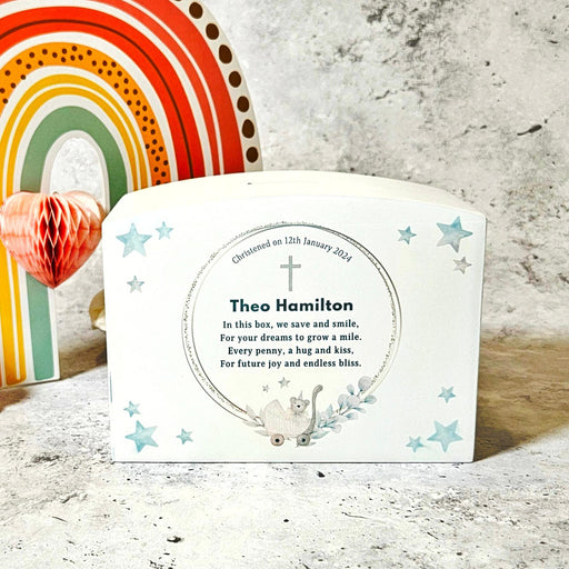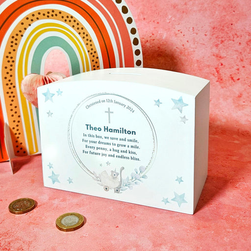 Save %Personalised Children's Christening Money Box - Custom Baptism Treasure Box