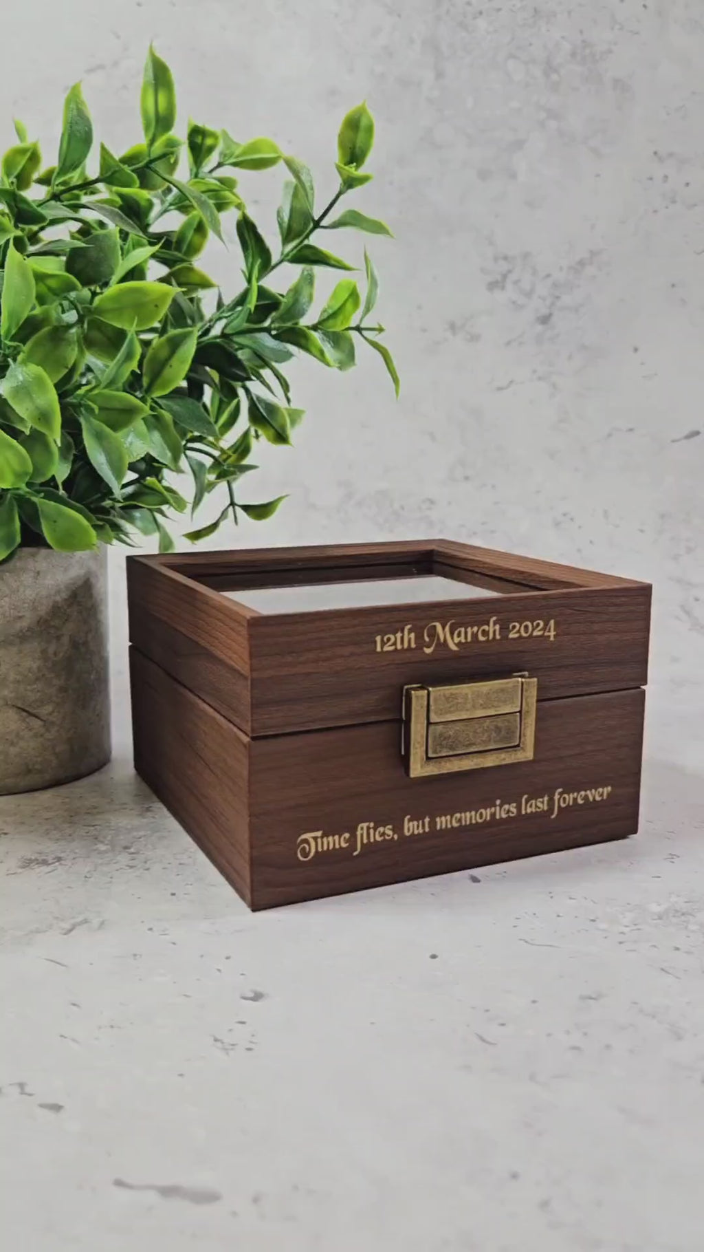 Beautifully crafted from rich walnut wood, this luxurious watch box combines practicality with sentiment. The smooth, warm wood grain and clear acrylic window top create a stunning display for his favourite timepiece, while the soft velvet lining keeps it safe from scratches.