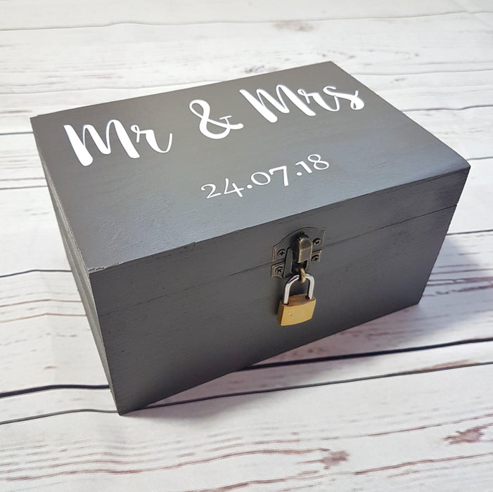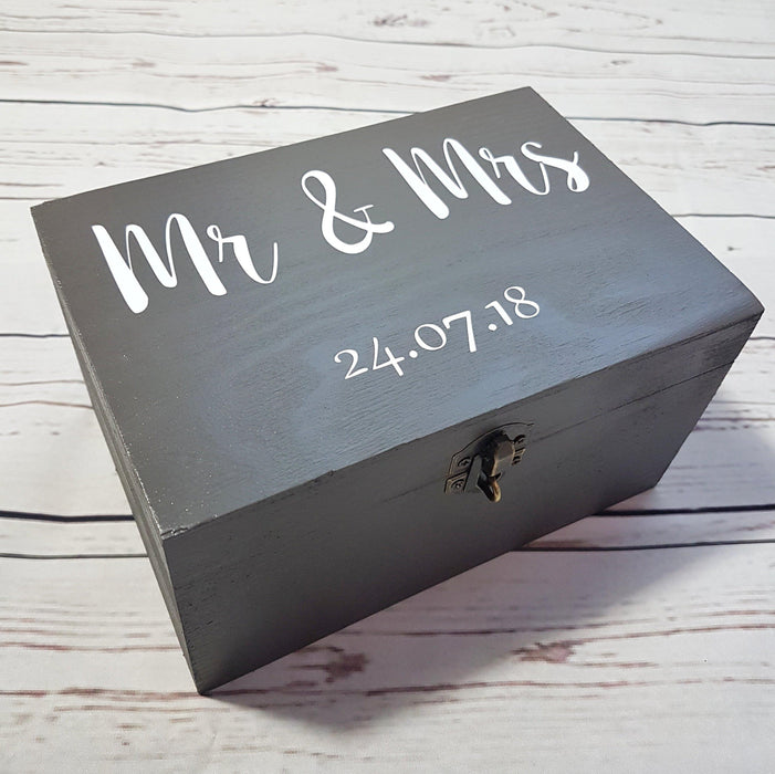 A beautiful, hand-painted grey wooden box, perfect for wedding/anniversary gifts. Just add a note to your order with your chosen personalised text!