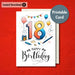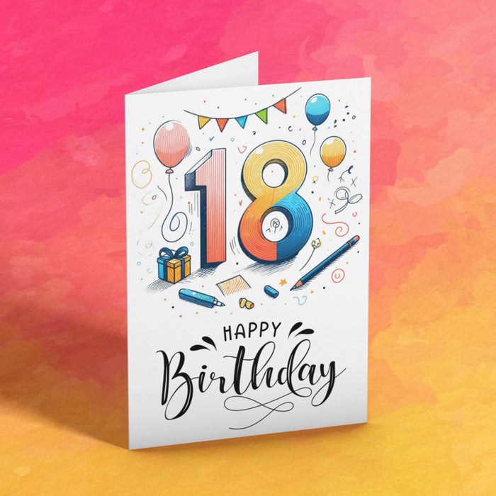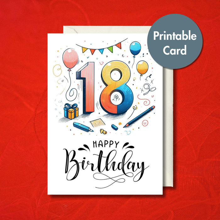 Celebrate a loved one's 18th birthday with a fun card that's a splash of colour and joy! This bright and festive printable card is perfect for friends and family, featuring balloons and birthday cheer. Ready for instant download, it’s the perfect way to share in the excitement of their special day.