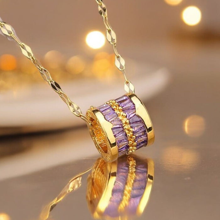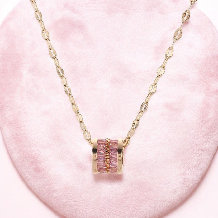 Give her the best gift with this exquisite Sparkling Crystal Barrel Pendant Necklace. This luxurious piece features a stunning gold chain with dazzling barrel-shaped pendant encrusted with shimmering crystals, making it an ideal gift for any special occasion. Crafted with high-quality stainless steel, the necklace is available in three stunning colours: Pink, Purple, and White. Whether it's for a birthday, anniversary, or just to show appreciation, this necklace is sure to make her feel cherished and elegant.