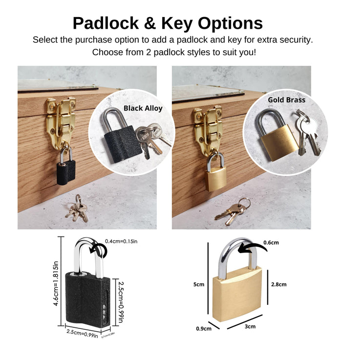 The box also includes a secure gold iron toggle latch with hasp catch, which also has an option to add a padlock and key for increased security - great for storing precious and valued items. (Lock and Key option available at checkout)