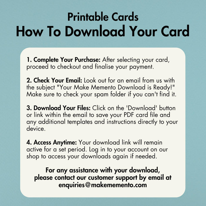 If you have any problems downloading or printing your card, please contact our customer support by email at enquiries@makememento.com for quick assistance.